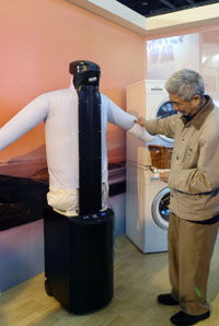 日前在上海舉行的“2008中國家電博覽會”上,國內(nèi)外廠商紛紛亮出最新的時尚家電產(chǎn)品。其中,液晶顯示屏在廚房家電上的普遍采用使家務(wù)勞動更具趣味性;同時,更人性化的時尚設(shè)計使家電產(chǎn)品讓家務(wù)勞動更“省力”。圖為展會展出的全自動熨衣機(jī)。
