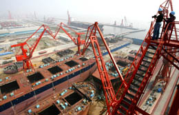 中國船舶工業(yè)集團公司長興造船基地地處上海吳淞口外長興島,被稱為中國“巨輪島”。2008年,預(yù)計該基地總投資150億元的一期工程將竣工,在島上“出生”的萬噸巨輪將達9艘。該基地的船舶產(chǎn)品包括大型油輪、液化天然氣船、超大型集裝箱船等,造船訂單已排到2011年。整個基地分兩期建設(shè),計劃2015年建成。屆時,這個基地將擁有7個大船塢,年造船能力達1200萬噸。