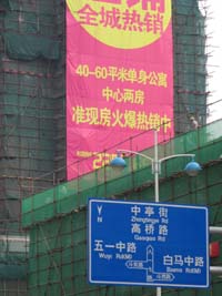 福州鬧市中心新落成的樓盤展開促銷攻勢。 | 福州、廣州、遼寧鞍山等地樓市在經歷了近半年的成交縮量之后,“五一”期間,房地產開發(fā)商為抓住小長假的大商機,紛紛鉚足勁促銷樓盤,掀起一波波促銷“熱浪”。開發(fā)商希望借此使今年以來持續(xù)處于“望季”狀態(tài)的樓市迎來久違的“旺季”。