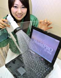 日前,日本電氣公司(NEC)的雇員在東京展示一款新型防水電腦“Shield Pro”。這款電腦采用英特爾雙核處理器,配備12.1英寸顯示器和防水機(jī)身,預(yù)計(jì)將于6月上市銷售。