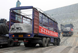 湖北省電力公司根據(jù)國家電網(wǎng)公司要求,急調(diào)5500根水泥電線桿經(jīng)水路運往四川災(zāi)區(qū),維修受損電網(wǎng)。為了讓這批救災(zāi)物資順利進川,三峽有關(guān)部門開通了三峽專用公路放行。5月17日,運送電線桿的車隊經(jīng)三峽專用公路抵達湖北秭歸銀杏沱碼頭,在這里乘滾裝船前往重慶萬州,再經(jīng)陸路運達四川災(zāi)區(qū)。新華社發(fā)(劉保平