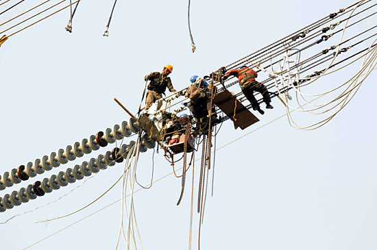 5月26日,在河南省博愛縣境內(nèi),我國首條百萬伏級(jí)特高壓試驗(yàn)示范輸電線路工程的施工人員進(jìn)行高空架線作業(yè)。