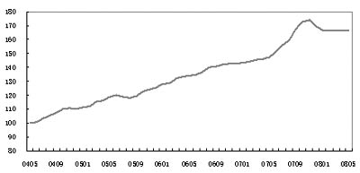 2008年5月,中原(廣州)領(lǐng)先指數(shù)為167.4,環(huán)比小幅上升0.6個(gè)百分點(diǎn),成交量環(huán)比增長約兩成,這也是支撐5月房價(jià)上漲的最主要因素。