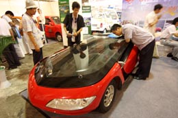6月27日,一輛外形酷似跑車的電動車吸引了觀眾駐足觀看。當(dāng)日,為期3天的2008第四屆中國國際電動車暨休閑運(yùn)動車展在北京中國國際展覽中心開幕。
