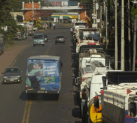 國際油價的大幅上漲使得石油嚴(yán)重依賴進(jìn)口的巴拉圭面臨嚴(yán)重的能源危機(jī),巴拉圭石油公司(Petropar)至今仍拖欠外國石油公司3.2億美元的費(fèi)用,國內(nèi)成品油供應(yīng)嚴(yán)重不足。近30%的公交車和出租車因?yàn)槿庇蜔o法工作,正在收割季節(jié)的農(nóng)業(yè)部門也因?yàn)槿加凸⿷?yīng)不足蒙受巨大損失。圖為7月15日,巴拉圭首都各加油站的運(yùn)油車在巴拉圭石油公司大門前排起長隊,等待加油。 |