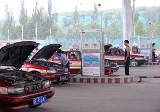 在油價(jià)不斷走高的背景下,山西晉城、太原等地不少汽車紛紛“改油換氣”。晉城全市近2000輛出租車和大量家庭轎車已改用煤層氣作燃料,昔日的“礦井殺手”———煤層氣(瓦斯),變成了汽車的燃料新寵。圖為晉城市一處煤層氣加氣站的工作人員正在為汽車加氣。