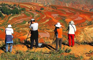 云南東川的紅土地總面積達(dá)20平方公里,一年四季中,洋麥花、蕎子花、油菜花和蘿卜花等交替開放,色彩斑斕,成為著名旅游景觀。圖為幾位攝影愛好者在東川拍攝紅土地。本報記者:楊牧源