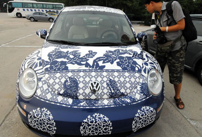 日前,在北京農(nóng)展館拍攝的一輛車身上繪有青花瓷圖案。隨著北京奧運會的召開,中國特色的奧運元素滲透到生活中的每個角落。