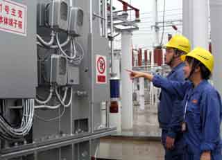 四川省江油市220千伏大康變電站日前舉行竣工投產(chǎn)儀式,這標(biāo)志著國家電網(wǎng)四川省電力公司受損設(shè)施原地重建工作全面完成,轉(zhuǎn)入規(guī)劃重建階段。汶川大地震導(dǎo)致四川省電力公司35千伏及以上變電站停運(yùn)171座,包括配網(wǎng)線路在內(nèi)10千伏及其以上線路停運(yùn)2769條,造成公司系統(tǒng)財(cái)產(chǎn)損失106.5億元。圖為四川江油市大康變電站職工正在檢查設(shè)備運(yùn)行情況。 |