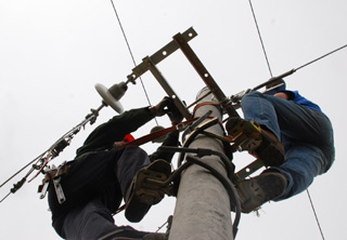 長(zhǎng)期以來,青海牧區(qū)的藏族牧民只能依靠自家的太陽能光伏板發(fā)電,電流量小、電壓不穩(wěn),大多數(shù)家用電器無法使用。國家電網(wǎng)公司在青海省啟動(dòng)“戶戶通電”工程后,大電網(wǎng)不斷向牧區(qū)延伸入戶,為10多萬藏族牧民送上了放心電力。圖為青海省興海供電公司施工人員在為莫多村架設(shè)“戶戶通電”線路。