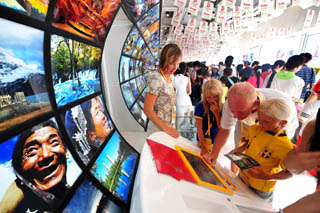 奧運(yùn)催生了北京新的商圈,奧林匹克中心區(qū)周?chē)纳虡I(yè)物業(yè)面臨新的發(fā)展機(jī)遇。圖為游客正在奧林匹克中心區(qū)的一個(gè)贊助商展館內(nèi)參觀。