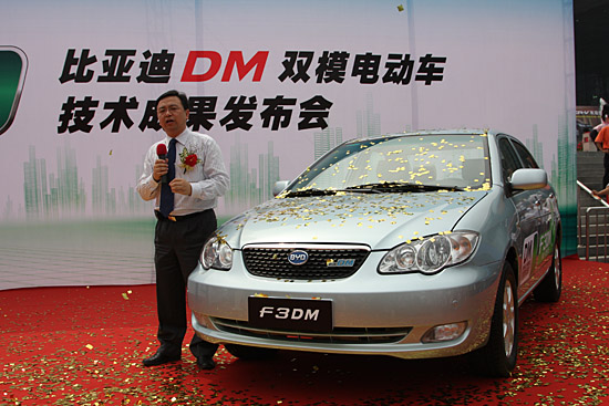 10月12日上午,深圳高交會(huì)開幕當(dāng)日,我國(guó)自主品牌汽車代表企業(yè)之一比亞迪公司發(fā)布重大科技成果,該公司歷時(shí)數(shù)年研制的比亞迪F3DM雙模新能源轎車已完成各項(xiàng)測(cè)試,將于今年年底正式上市。屆時(shí)比亞迪將成為世界上第一個(gè)實(shí)現(xiàn)油電混合和電動(dòng)雙模轎車商業(yè)化的企業(yè)。圖為比亞迪總裁王全福在發(fā)布會(huì)上詳解什么是雙模轎車。