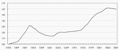2008年9月,中原(上海)領(lǐng)先指數(shù)為159點,樣本成交均價為18294元/平方米,環(huán)比下跌0.52%;同時二手房成交量也繼續(xù)大幅萎縮,環(huán)比上月減少了20%左右?傮w來說,9月上海二手房市場繼續(xù)呈現(xiàn)量價齊跌的態(tài)勢。