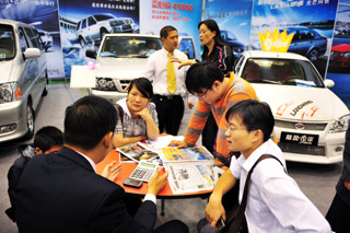 2008青島秋季車交會(huì)近日舉行,各汽車經(jīng)銷商紛紛推出各種購車優(yōu)惠吸引顧客,力爭在“金九銀十”傳統(tǒng)汽車銷售旺季結(jié)束前爭得更多的市場(chǎng)份額。圖為幾位參加團(tuán)購的顧客正在向經(jīng)銷商爭取更多的優(yōu)惠。本報(bào)記者:李紫恒