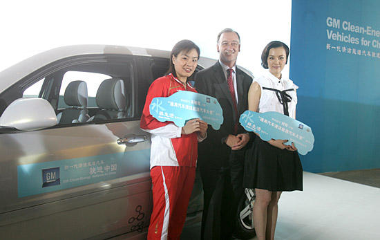 通用汽車中國(guó)公司總裁兼總經(jīng)理甘文維(中)授予奧運(yùn)會(huì)跳水冠軍吳敏霞(左)及影視明星劉孜“通用汽車清潔能源汽車大使”稱號(hào)。