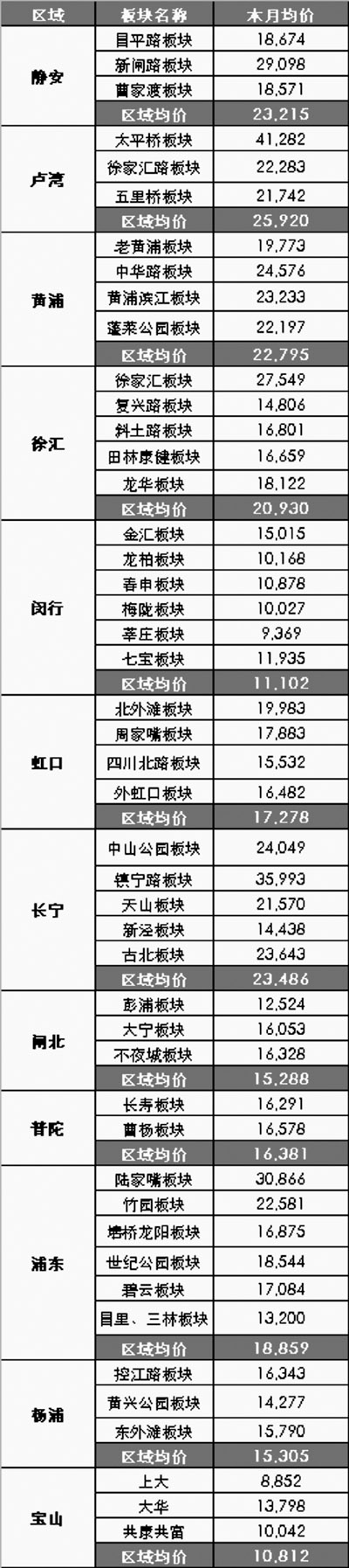 上海市各區(qū)域、板塊均價(jià)(單位:元/平方米)