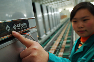 美菱集團2007年、2008年連續(xù)兩年被商務部列入“家電下鄉(xiāng)”企業(yè)。美菱針對農(nóng)民的實際需求,在產(chǎn)品設計上,特別采用防潮防銹材料,增加了節(jié)能、寬電壓啟動等個性化功能,并采用適合農(nóng)村路況的包裝設計。圖為工作人員介紹一款“家電下鄉(xiāng)”冰箱的特殊標識。