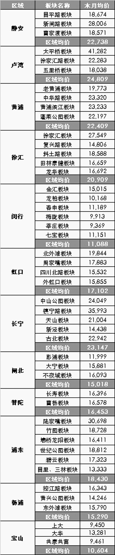 上海市各區(qū)域、各板塊均價(jià)(單位:元/平方米)