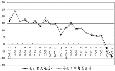 來自電力部門的統(tǒng)計數據顯示,11月份全國用電量同比增長-8.33%,這是在10月份用電量增長-2.18%的基礎上出現大幅下滑。有專家預計,12月份用電量還會繼續(xù)下降。 電力向來被視為國民經濟的“晴雨表”,透過用電量的增長可以準確把握產業(yè)、行業(yè)的發(fā)展狀況及宏觀經濟的走勢。 由國網北京經濟技術研究院副院長胡兆光博士繪制的一份“2007年以來各月我國全國及各行業(yè)用電量增長速度”圖表(圖1)顯示:全國月度用電量增長率在2007年3月曾高達23.88%,全行業(yè)(一、二、三產)月度用電量增長率也達到23.48%。此后便呈起伏式下滑,全國用電量10月份同比增長-2.18%,11月份同比增長-8.33%。 “首先,受全球金融危機影響,我國部分出口行業(yè)的用電量增速下滑最為明顯!焙坠庹f,“特別是嚴重依賴出口的紡織業(yè)等正在步入衰退期! 記者從他繪制的“2007年以來各月部分出口行業(yè)用電量增長速度”圖表(圖2)中看到,紡織業(yè)的用電增速在2007年基本維持在10%左右,從今年3月份起開始下滑,7月份為-0.4%,8月份為-0.7%,9月份為-0.79%,10月份為-9.49%,11月份達到-12.34%,已經連續(xù)5個月為負增長。服裝鞋帽及其制品業(yè)和木材加工家具制造業(yè)的用電量也在10月份分別出現-11.17%和-2.98%的負增長,11月份分別為-7.8%和-14.6%的負增長。 胡兆光說:“國際金融危機已經直接影響到我國部分行業(yè)的生產經營。盡管我國政府在今年下半年陸續(xù)調整出口退稅政策,但從目前看很難扭轉這種下滑的局面! “其次,受國內市場影響較大的黑色、有色行業(yè)的用電量也呈現大幅度下降!焙坠飧嬖V記者,黑色、有色行業(yè)的用電量增長今年10月份分別為-16%及-8.9%,到11月份更分別降至-24.5%及-14.5%。(圖3)他說:“黑色、有色行業(yè)的發(fā)展與房地產有直接的關聯。房地產業(yè)的不景氣導致對鋼材、鋁等產品的需求不旺。”此外,今年10月份用電負增長的行業(yè)還有:印刷、文體用品制造業(yè)用電增速分別為-6.5%和-10.5%;化工業(yè)為-8.57%,其中氯堿為-28.9%,電石為-27.7%;醫(yī)藥制造、化纖制造、橡膠塑料制造業(yè)也是負增長。11月份用電負增長的行業(yè)已擴大到采礦業(yè)為-12.5%,及占全國當月用電量的一半的制造業(yè)中的20個行業(yè)均為負增長。但建筑、交通、信息服務、住宿餐飲、服務及機關等行業(yè)用電增速還是正的。 |