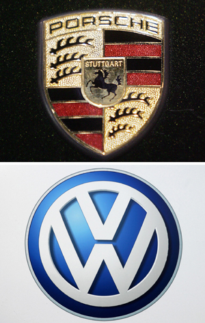 這張拼版照片顯示的是保時捷(上)與大眾(下)汽車的標識。