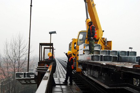 1月6日,施工人員在江西九江長江大橋鐵路北引橋上行線吊裝鋼柱底座。 當(dāng)日,京九鐵路電氣化工程九江長江大橋鐵路橋改造全面動工。九江長江大橋鐵路橋改造是京九鐵路電氣化工程的控制性工程,施工難度大,計劃于2010年6月完工。