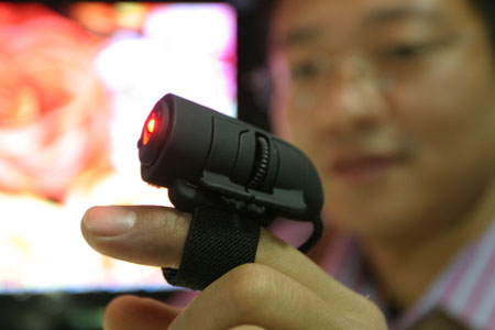 日前,天津一電腦商城展示新近上市的“手指鼠標(biāo)”。與其他鼠標(biāo)不同,這款鼠標(biāo)不用整個(gè)手掌來(lái)操作,運(yùn)用紅外線傳感原理,通過(guò)鼠標(biāo)末端上的激光頭打出紅外線,從而判斷鼠標(biāo)指針的方向。