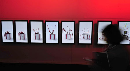 參觀者在體驗美國NBC電視臺與微軟公司共同推出的桌面屏幕。