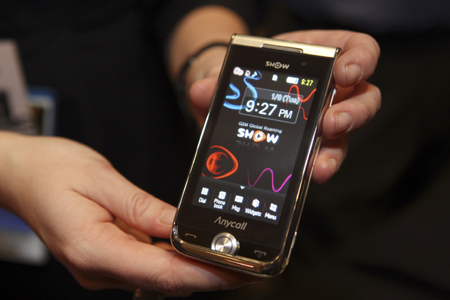 工作人員展示韓國三星公司開發(fā)的一款可作為投影儀使用的手機。