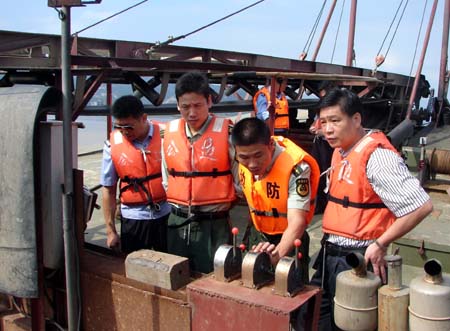 福州市邊防支隊(duì)官兵正在一艘采砂船上檢查。 新華社記者:康淼