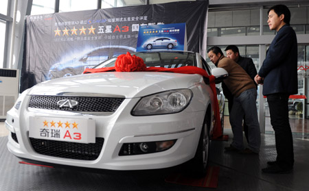 1月20日,幾位顧客在安徽合肥一家奇瑞汽車4S店觀看一輛兩廂奇瑞A3轎車。本報(bào)記者:陳曄華 攝