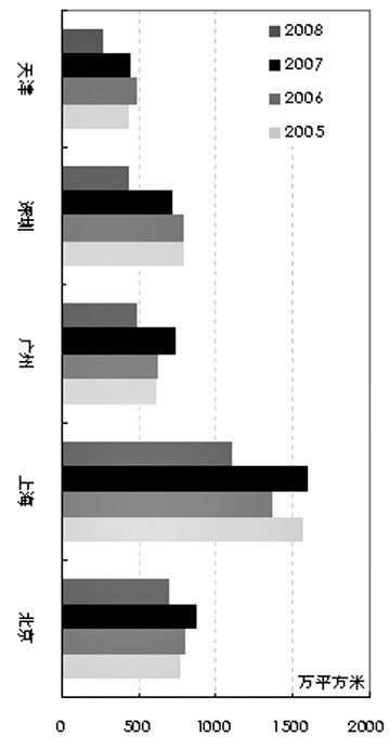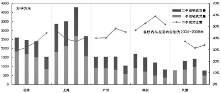 ●根據(jù)中原地產(chǎn)研究中心統(tǒng)計,2008年全年五大城市二手住宅總成交面積僅3003萬平方米,較2007年下降31.6%,也是最近四年來的最低水平,市場低迷可見一斑。 ●從區(qū)域來看,珠三角城市萎縮較為嚴重,廣州和深圳2008年二手住宅成交量分別同比下跌34.5%和38.2%。而全國其他主要區(qū)域二手住宅市場亦有不同程度回落。 ●在珠三角城市帶領下,北京、上海和天津的二手房價在2008年第二季度開始出現(xiàn)下滑。第四季度起,受宏觀經(jīng)濟和金融危機的影響,價格下調(diào)速度有所加快。