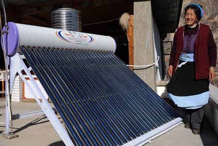 近年來,平均海拔3000多米的云南省迪慶藏族自治州大力開發(fā)太陽能資源,發(fā)展農(nóng)村新能源建設(shè),太陽能熱水器、太陽能灶等設(shè)施廣泛進(jìn)入藏族群眾的家庭。隨著太陽能的推廣,有效地改善了當(dāng)?shù)氐纳鷳B(tài)環(huán)境。圖為德欽縣奔子欄村的藏族婦女卓瑪在自家的太陽能熱水器旁。