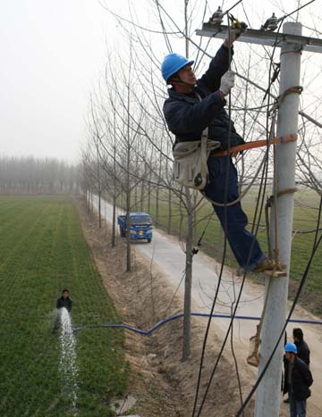 面對當(dāng)前嚴(yán)重的旱情,安徽淮北電力部門積極行動,組織抗旱保電突擊隊,深入鄉(xiāng)鎮(zhèn)農(nóng)田灌溉現(xiàn)場,增設(shè)線路、變壓器等配電設(shè)備,并對電灌站進(jìn)行24小時值班巡查,全力以赴保障麥田抗旱灌溉用電。圖為淮北供電公司員工在淮北市烈山區(qū)古饒鎮(zhèn)增設(shè)抗旱用電線路,方便農(nóng)民使用抽水機(jī)抽水澆麥。