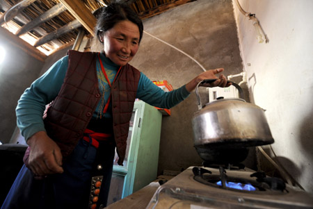 甘肅省甘南藏族自治州推廣農(nóng)牧村沼氣建設(shè),計劃在未來幾年內(nèi),在所屬31個鄉(xiāng)鎮(zhèn)、75個行政村新建5600口沼氣池,讓這些地方60%左右的群眾用上清潔能源沼氣。圖為甘南州合作市卡加曼鄉(xiāng)香拉村村民娘毛塔在沼氣爐上燒開水。