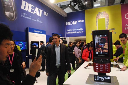 日前,世界移動(dòng)通信大會(huì)在西班牙巴塞羅那舉行,本次大會(huì)匯集了世界各大電信運(yùn)營(yíng)商、增值服務(wù)提供商和設(shè)備制造商,共有來自世界各地的1280多家公司參展。圖為三星公司展區(qū)內(nèi)碩大的手機(jī)模型非常引人注目。