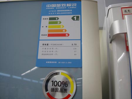 記者日前在北京大中電器牛街店走訪時看到,電冰箱、洗衣機(jī)、空調(diào)等家電產(chǎn)品都在醒目位置貼上了能效標(biāo)識。 正在選購冰箱的王小姐告訴記者:“我們每天都會用到冰箱等家電,如果耗電量很大,將會是一項較大的開支。所以我在選購時會首先考慮它的耗電量,看是不是達(dá)到了高效節(jié)能的水平! 記者在采訪中發(fā)現(xiàn),像王小姐這樣的消費(fèi)者還有很多,他們在購買電器時很注重觀看產(chǎn)品上的能效標(biāo)識是不是達(dá)到一級能效水平,不過對于能效標(biāo)識的具體內(nèi)容和節(jié)能計算方法卻并不清楚。 據(jù)了解,家電產(chǎn)品的能效標(biāo)識共分為5級:1級能效最高,目前市場上產(chǎn)品有少數(shù)能達(dá)到;2級是節(jié)能評價值,產(chǎn)品能效達(dá)到2級或以上就可以向認(rèn)證機(jī)構(gòu)申請節(jié)能產(chǎn)品;5級是能效限定值,是市場準(zhǔn)入的門檻,低于該值的產(chǎn)品將不能在市場上銷售。 伊萊克斯專柜的售貨員表示,現(xiàn)在能效標(biāo)識已成為消費(fèi)者選購的一個重要指標(biāo),但它的具體計算比較復(fù)雜。以冰箱為例,它還要考慮到冷藏量的大小以及開門的次數(shù)等等。