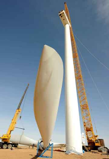 圖為施工人員正在內(nèi)蒙古巴彥淖爾市烏拉特后旗烏力吉風(fēng)電場(chǎng)吊裝風(fēng)機(jī)。到2010年,內(nèi)蒙古風(fēng)電裝機(jī)容量將達(dá)到500萬(wàn)千瓦以上。本報(bào)記者:張領(lǐng)