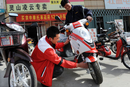 3月16日,山東萊西市夏格莊鎮(zhèn)一位青年農(nóng)民(左)在新興路一摩托車銷售點選購享受國家補(bǔ)貼的摩托車。本報記者:李紫恒