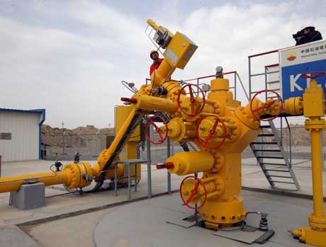 中國(guó)石油塔里木油田公司日前已累計(jì)向西氣東輸供氣486億立方米。過(guò)去5年來(lái),來(lái)自中國(guó)西北角塔里木盆地的天然氣,已使14個(gè)省區(qū)80多個(gè)大中城市的3億多居民從中受益,成為中國(guó)能源發(fā)展史上濃墨重彩的一筆。圖為中國(guó)石油塔里木油田公司克拉2-7井的工人在工作。