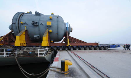 天津石化100萬噸乙烯及配套項目整臺重量最重、最昂貴的設備——EO反應器日前在天津臨港順利完成滾裝卸船作業(yè)。據(jù)介紹,該設備本體凈重1182噸,采購價格逾2億元人民幣。圖為施工人員在進行EO反應器卸船作業(yè)。