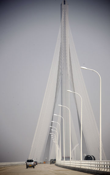 國家“十一五”重大建設(shè)項目上海長江隧橋工程目前已進(jìn)入后期施工階段,預(yù)計將于2009年年底前建成通車。 上海長江隧橋工程于2004年12月28日正式啟動。該工程由長江隧道和長江大橋組成。長江隧道南起浦東五號溝,穿越長江到達(dá)長興島,再通過長江大橋連接崇明島,北止于崇明陳家鎮(zhèn),全長約25.5公里,其中,長江隧道長約8.9公里,長江大橋長約10.3公里。圖為一輛汽車正從上海長江大橋的主塔下經(jīng)過。