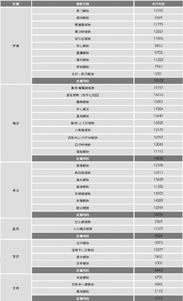 深圳市各區(qū)域、各板塊均價(單位:元/平方米)