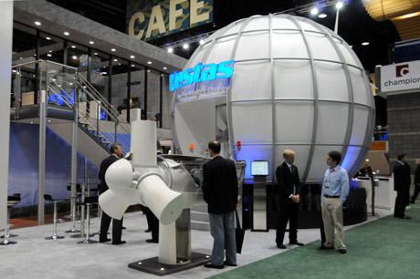 5日,在美國芝加哥舉行的國際風(fēng)能展上,觀眾在世界最大的風(fēng)電設(shè)備制造商丹麥維斯塔斯公司的展臺參觀。美國國際風(fēng)能展于5月4日至7日在芝加哥舉行。來自美國、挪威、德國、韓國、中國等國家的風(fēng)能設(shè)備制造企業(yè)展出他們最新的風(fēng)能設(shè)備。