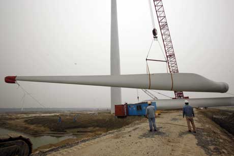 6月2日,工人們正在江蘇如東風(fēng)電特許權(quán)二期項(xiàng)目吊裝電機(jī)組的葉片。2008年,如東風(fēng)電場(chǎng)風(fēng)機(jī)平均可利用率達(dá)到98.93%,為同類機(jī)型全球最高。截至今年5月底,該項(xiàng)目已累計(jì)發(fā)電近9億千瓦時(shí),相當(dāng)于節(jié)約標(biāo)準(zhǔn)煤34萬(wàn)噸,節(jié)水180萬(wàn)噸。