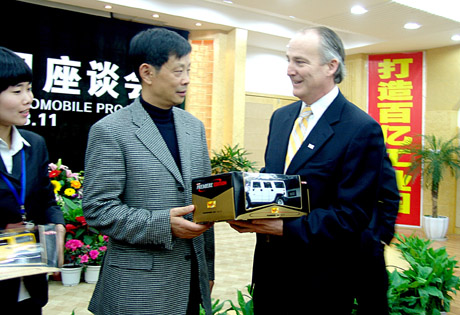 今年3月11日,悍馬首席執(zhí)行官JimTaylor在四川德陽(yáng)與騰中重工老板和德陽(yáng)當(dāng)?shù)卣賳T舉行了會(huì)談。這是JimTaylor向德陽(yáng)市委書(shū)記方小方贈(zèng)送悍馬車(chē)模。 新華社發(fā)黃建培攝 |