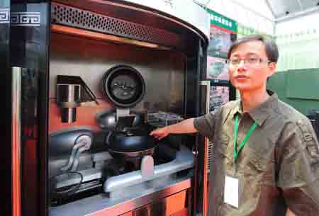 6月14日,2009中國北京國際節(jié)能環(huán)保展覽會開幕。本屆展覽的主題是“綠色產業(yè)、綠色消費”。圖為一名工作人員在介紹一臺名為“烹飪機器人”的機器。