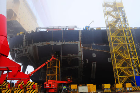 這是韓國(guó)STX(大連)造船有限公司船塢上正在生產(chǎn)的一艘輪船(6月9日攝)。 6月30日,世界最大規(guī)模的船塢在遼寧省大連市長(zhǎng)興島舉行竣工典禮,從而使這個(gè)新興的臨港工業(yè)區(qū)可以生產(chǎn)巨型船只。此次建成投入使用的船塢長(zhǎng)460米,寬135米,高14.5米。