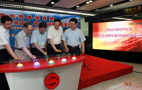 7月5日,上海地鐵電視經(jīng)過(guò)近半年的試運(yùn)營(yíng)后正式開(kāi)通,成為國(guó)內(nèi)首家進(jìn)行直播的地鐵電視。圖為有關(guān)各方在上海地鐵浦東世紀(jì)大道站啟動(dòng)上海地鐵直播電視。