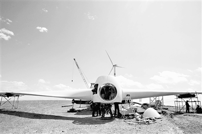 在內(nèi)蒙古自治區(qū)通遼市霍林郭勒市境內(nèi),工人正在安裝風力發(fā)電機組。新華社發(fā)(鄭煥松攝) |