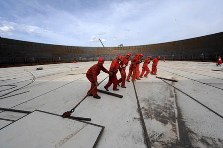 7月13日,新疆油建公司工人在10萬立方米大罐內(nèi)拖拽浮艙底板。 位于新疆東部的我國最大原油儲(chǔ)備庫設(shè)計(jì)總規(guī)模為800萬立方米,目前已有10座10萬立方米大罐投入使用,其余在建,施工進(jìn)展順利。原油儲(chǔ)備庫EPC項(xiàng)目總承包商新疆油建公司采用先進(jìn)的倒裝施工工藝,與傳統(tǒng)的正裝施工工藝相比,可提高工效15%左右,并避免高空作業(yè)。